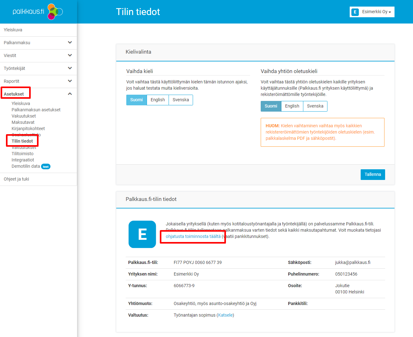 Valitse navigaatiosta Asetukset -> Tilin tiedot -> Palkkaus.fi-tilin tiedot. Klikkaa linkkiä "ohjatusta toiminnosta täällä", niin pääset päivittämään tiedot. Muutokset vahvistetaan pankkitunnuksilla.