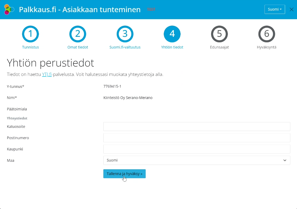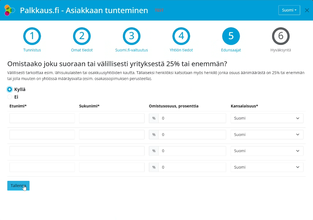 Seuraavaksi pitää täyttää omistajien lisätiedot. Täytä tiedot ja paina Tallenna.
