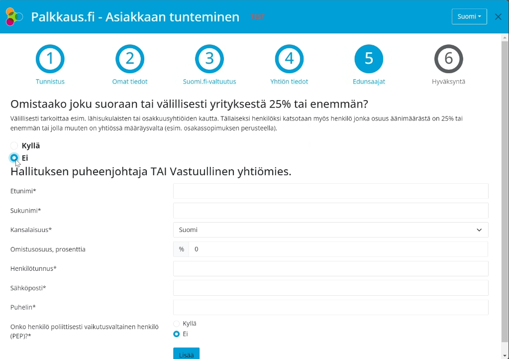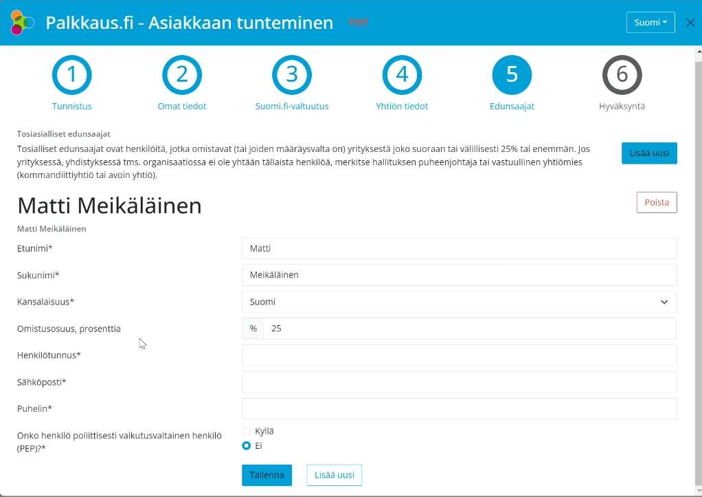 Täytä omat tiedot ja paina Seuraava.Jos olet poliittisesti vaikutusvaltainen henkilö, täytä myös syy avautuvaan kenttään.