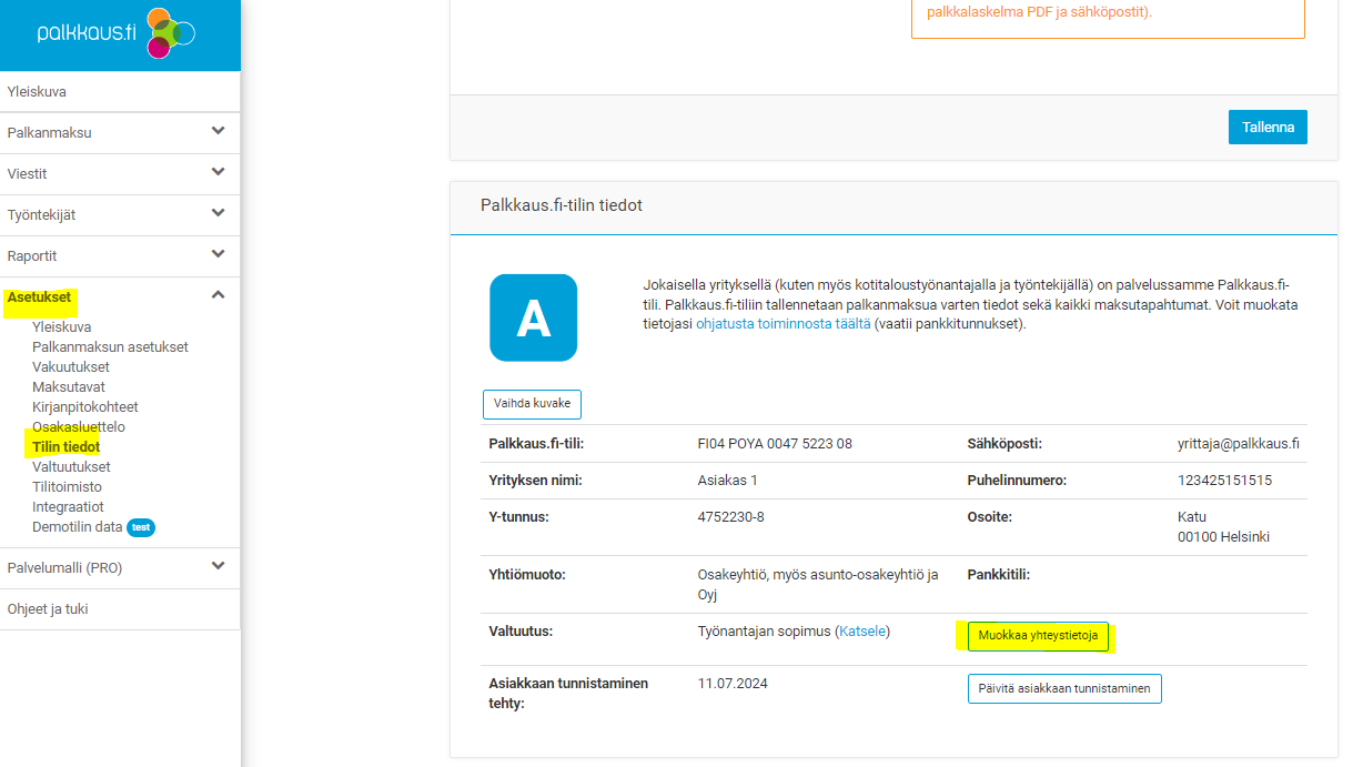 Yritystilin asetuksissa voi helposti päivittää yrityksen yhteystiedot. Ilmoitathan yrityksen yhteyssähköpostiksi sellaisen, josta tavoittaa palkanlaskennasta vastaavan henkilön. Osoitetiedot on hyvä olla ajan tasalla, sillä ne välitetään tulorekisterin kautta mm. vakuutusyhtiöille, jotka lähettävät laskut tulorekisteristä löytyvään osoitteeseen.