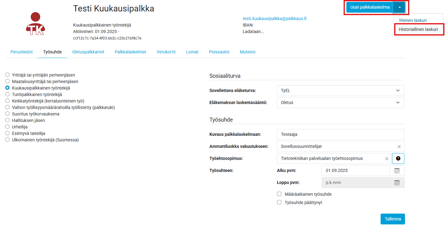 Historiallista laskelmaa pääset täyttämään Työntekijän tiedoissa Uusi palkkalaskelman nuolipainikkeesta ja tästä aukeaa valinta Historiallinen laskuri: