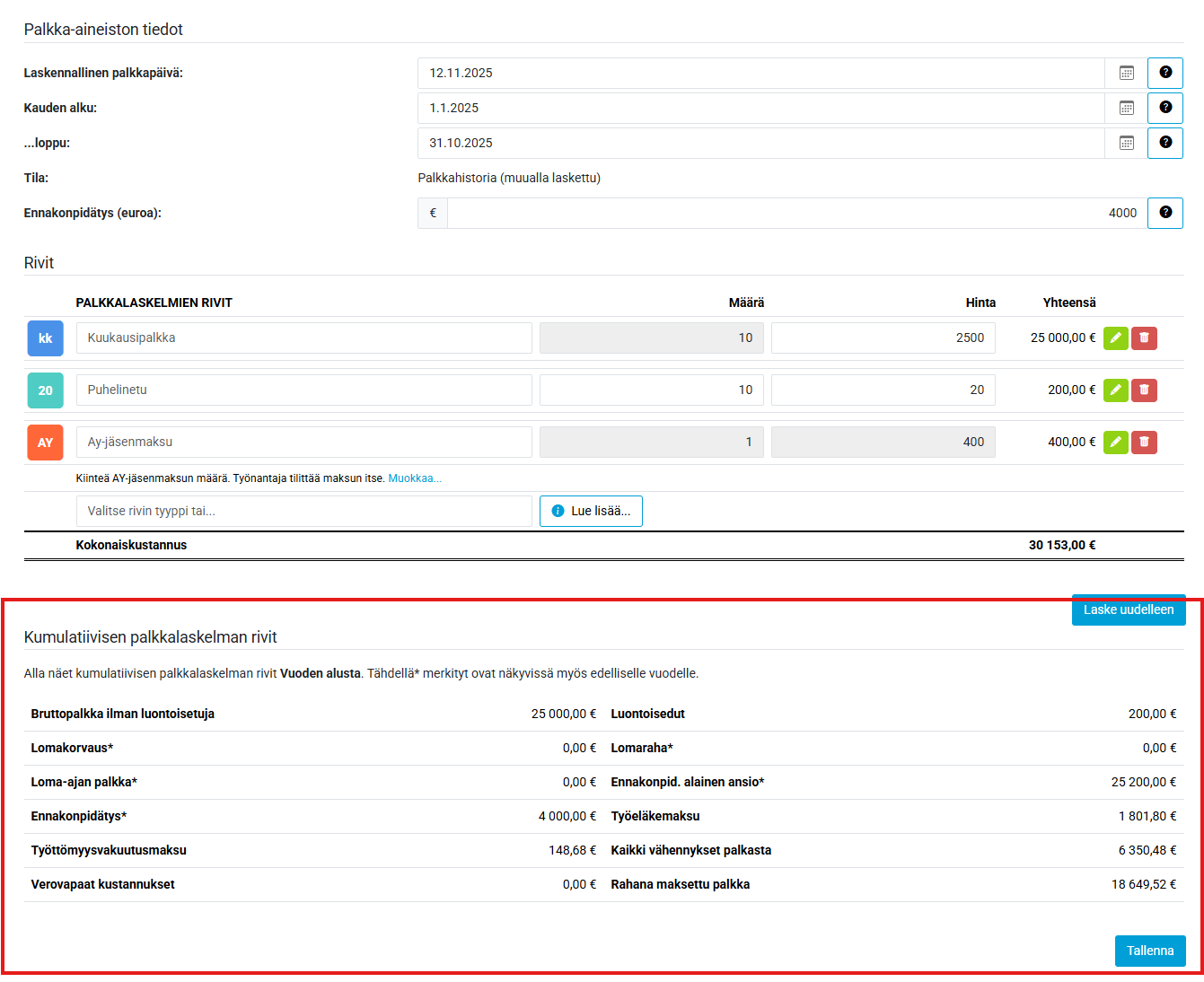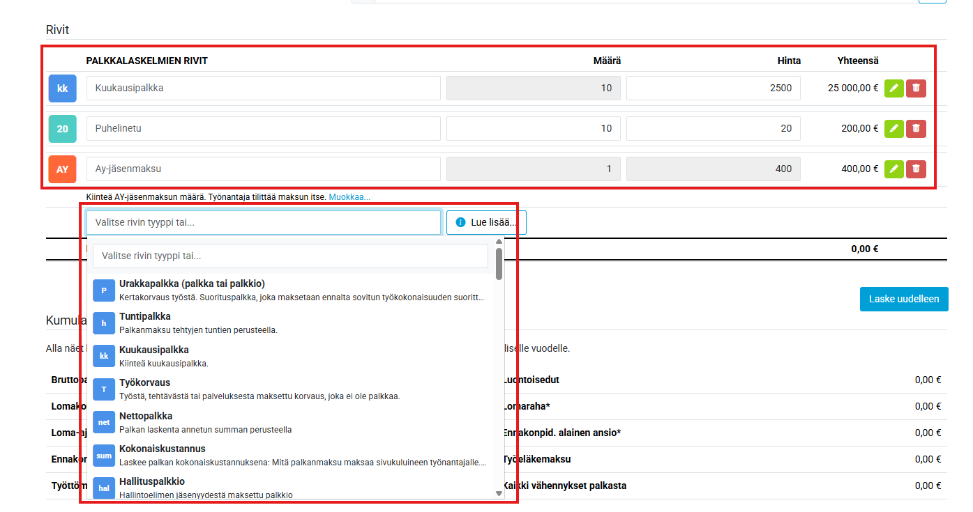 Kun palkkalajit ja summat on syötetty, niin paina Laske uudelleen niin ohjelma laskee vähennykset kumulatiiviselle laskelmalle: