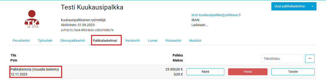 Historiallinen laskelma löytyy tallennuksen jälkeen henkilön tiedoista Palkkalaskelmat-välilehdeltä: