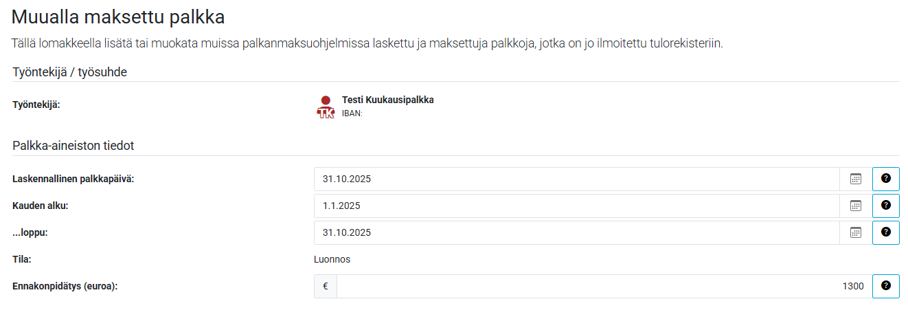 Kuvan esimerkissä ensimmäiset palkat maksetaan Palkkauksesta marraskuussa, joten halutaan viedä historialliset palkat ajalta 1.1.-31.10.2025. Ennakonpidätys viedään yhteensä-summana ko. ajalta.