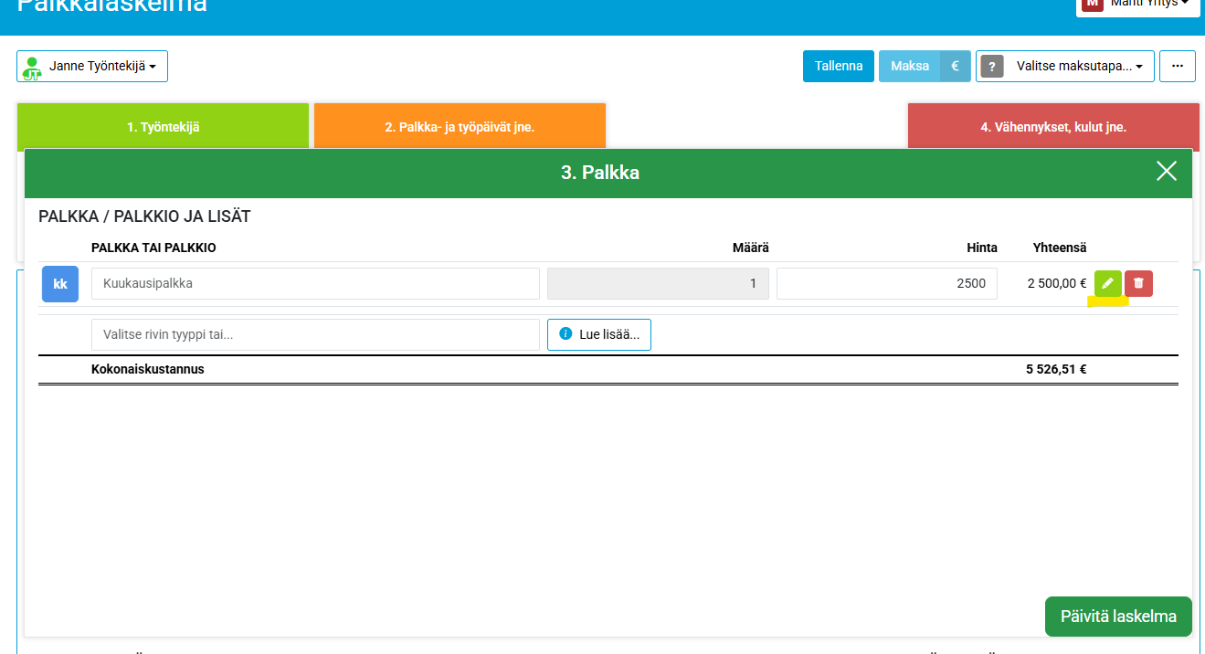 Palkkarivin tiliöintiin pääset klikkaamalla palkkarivin lopussa vihreällä pohjalla olevaa valkoista kynää.