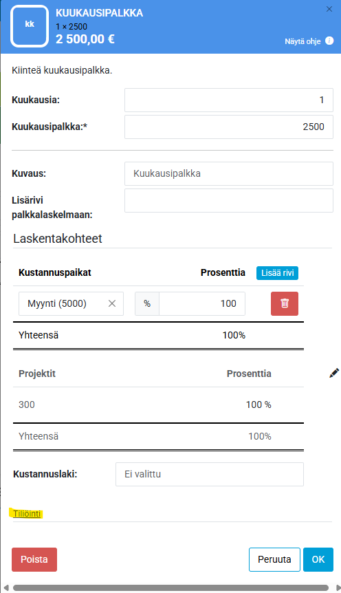 Tässä ohjeessa kerrotaan, kuinka voit tiliöidä palkkarivin tiliöintisäännöstä poikkeavalle kirjanpidontilille. Kirjanpitotilin ei tarvitse olla lisättynä tilikarttapohjassa, vaan siihen voi lisätä minkä vain numeron.
