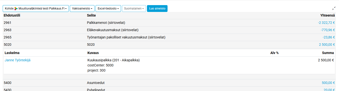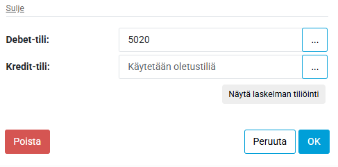 Näytä laskelman tiliöinnin painikkeella voit tarkistaa kuinka uusi tiliöinti menee kirjanpitoraportilla.