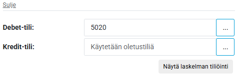 Tällöin avautuu kohta, jossa voit muuttaa kyseisen rivin tiliöintiä. Voit muuttaa pelkkää Debet tai Kredit tiliä, jos muutat vain toista, menee toinen tili oletuksen mukaan. Tilin nimeksi tulee kirjanpitotilin numero.