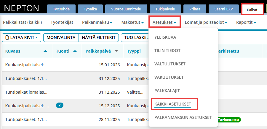 KTA-laskennan määritys löytyy Palkkojen puolelta Asetukset-Kaikki asetukset: