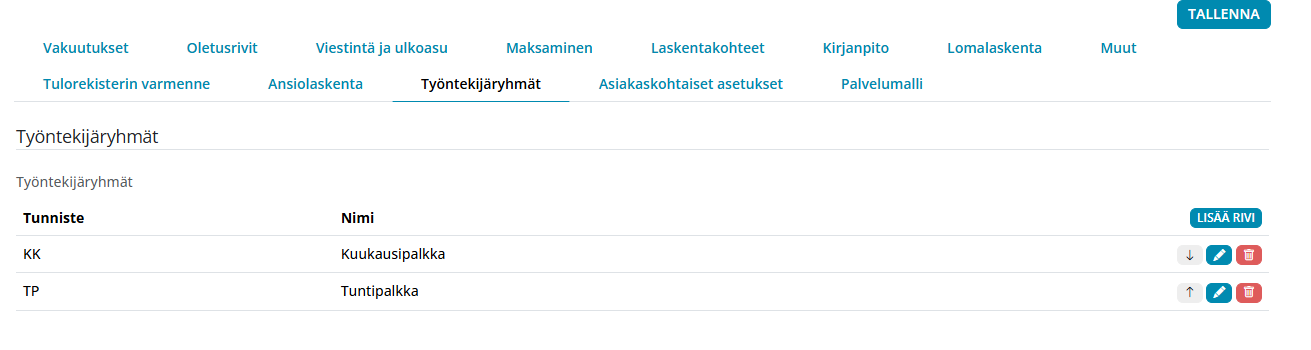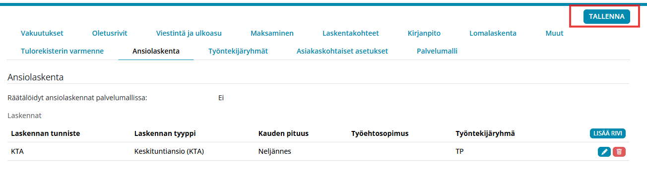Aukeaa seuraava näkymä, josta löytyy Ansiolaskenta sekä Työntekijäryhmät, jotka liittyvät KTA:n määrittelyihin. Pääset aloittamaan määrittelyt Lisää rivi-painikkeesta.
