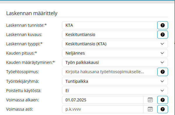 Tähdellä merkityt kentät ovat pakollisia ja kentät joissa on nuoli, ovat alasvetovalikkoja, joista voit valita sopivan vaihtoehdon. Työehtosopimus ja työntekijäryhmällä voit rajata kenelle henkilöille KTA lasketetaan. Huomioithan, että nämä tiedot tulee täydentää myös henkilöiden taakse jos näitä ei ole aiemmin käytetty.