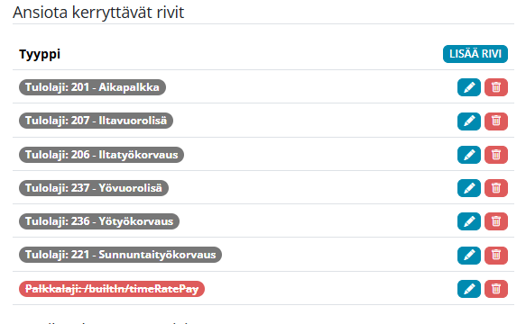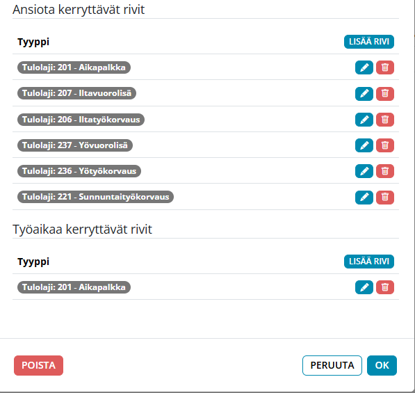 Kun perusmääritykset on kunnossa, siirrytään tekemään valinnat joiden perusteella muodostuu ansioita kerryttävät rivit sekä työaikaa kerryttävät rivit.