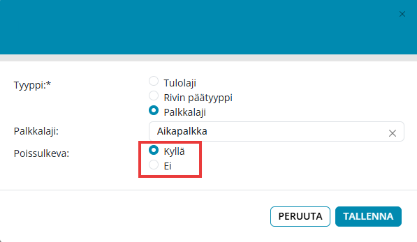 Jos halutaan jättää joku palkkalaji laskennasta pois, niin tällöin lisätään rivi johon merkitään ko. palkkalaji ja laitetaan päälle valinta poissulkeva niin ko. palkkalaji jää laskennasta pois ja näkyy ansioissa punaisena sekä yliviivattuna. Suosittelemme tekemään asetukset tulolajien mukaan ja jos joku palkkalaji käyttää ko. tulolajia ja halutaan jättää laskennasta pois, tehdään se poissulkevana valintana.