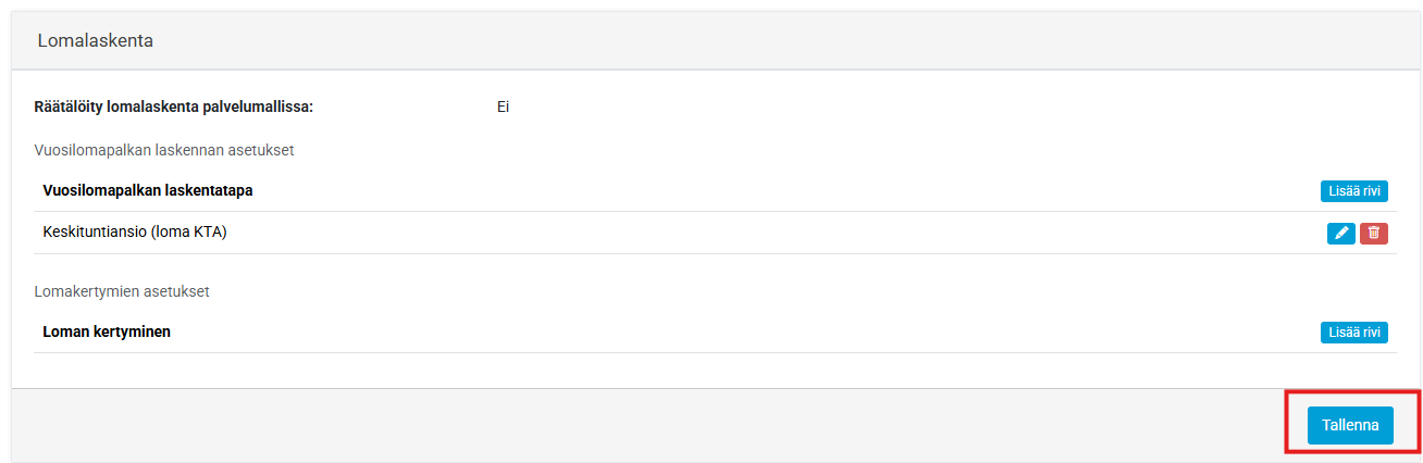 - Mikäli laskentaan tulee muutoksia niin voit aina perustaa uuden laskennan, johon laitat mistä lomavuodesta alkaen laskenta on käytössä ja päätät vanhan laskennan lomavuoteen, johon laskenta päättyy.
