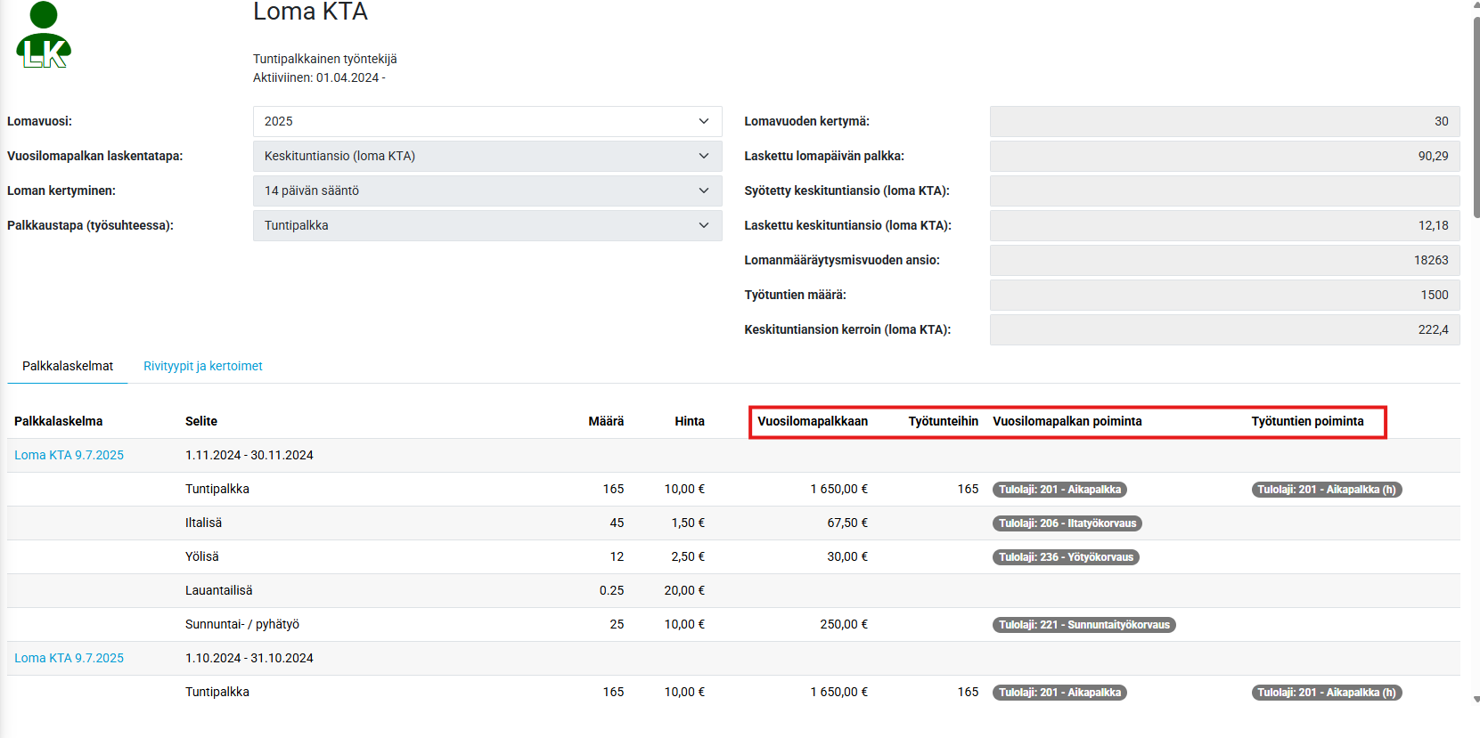 Kuvan esimerkissä loma-ansioita kerryttävät tulolajit Aikapalkka sekä Ilta-ja yövuorolisät ja työaikaa kerryttää ainoastaan aikapalkka, mutta laskennasta on otettu pois kuukausipalkan palkkalaji.
