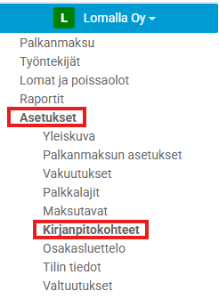 Lomapalkkojen asetukset löytyy Asetukset- Kirjanpitokohteet: