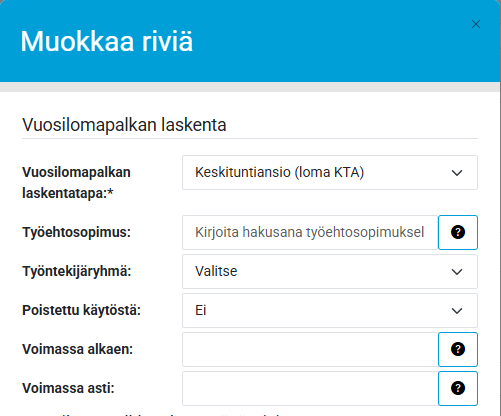 - Voimassa alkaen/voimassa asti avulla voi määrittää mistä lomavuodesta alkaen tai mihin lomavuoteen saakka laskenta on voimassa