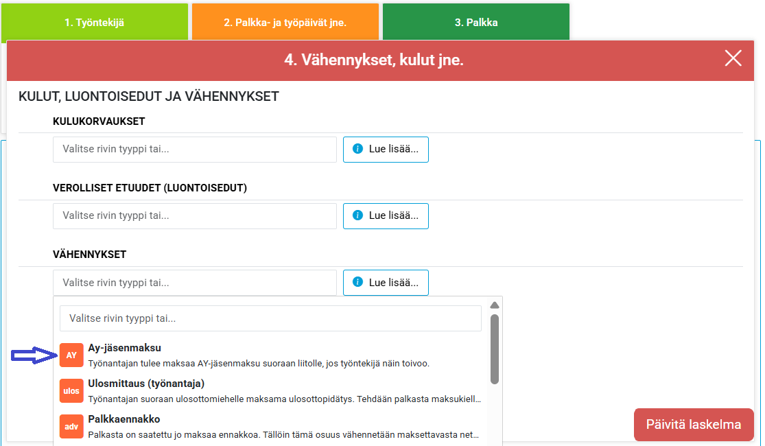 Palkkalaskelman osiosta 4. Vähennykset valikosta löytyy oma sarake Ay-jäsenmaksujen kirjaamiselle.