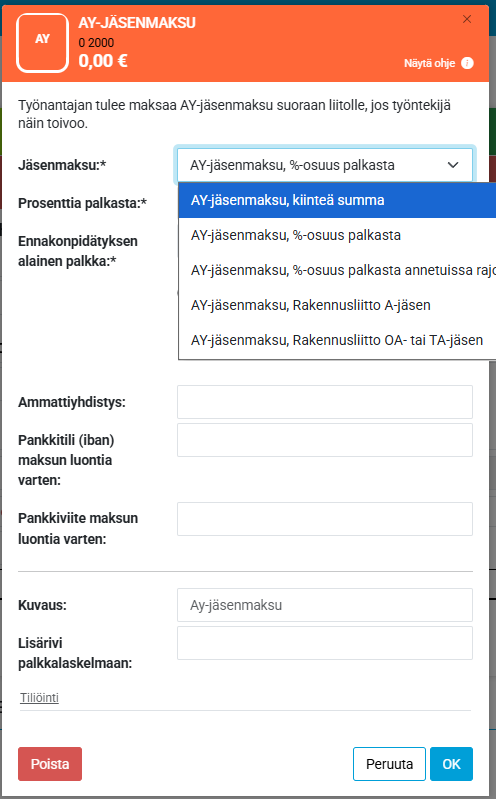 Ay-jäsenmaksujen kirjaaminen palkkalaskelmalle